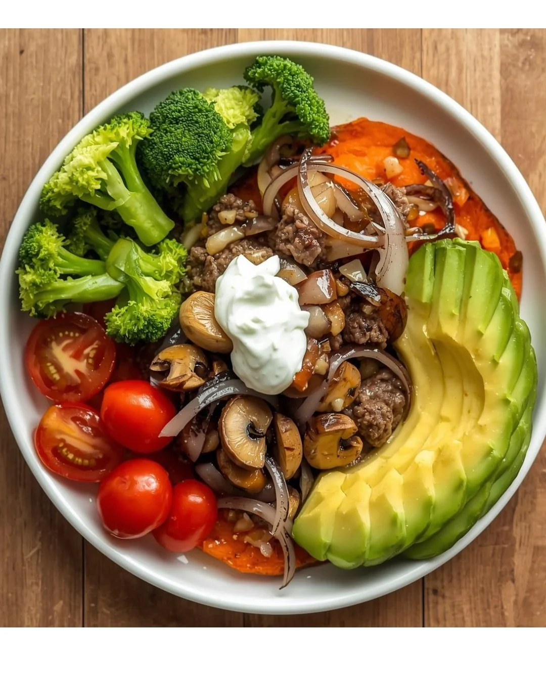 This plate is bold, balanced, and deeply satisfying. A roasted sweet potato becomes the base for savory ground beef, silky shiitake mushrooms, creamy Greek yogurt, and vibrant vegetables. It’s protein-forward, rich in fiber, and finished with healthy fats that bring everything together.